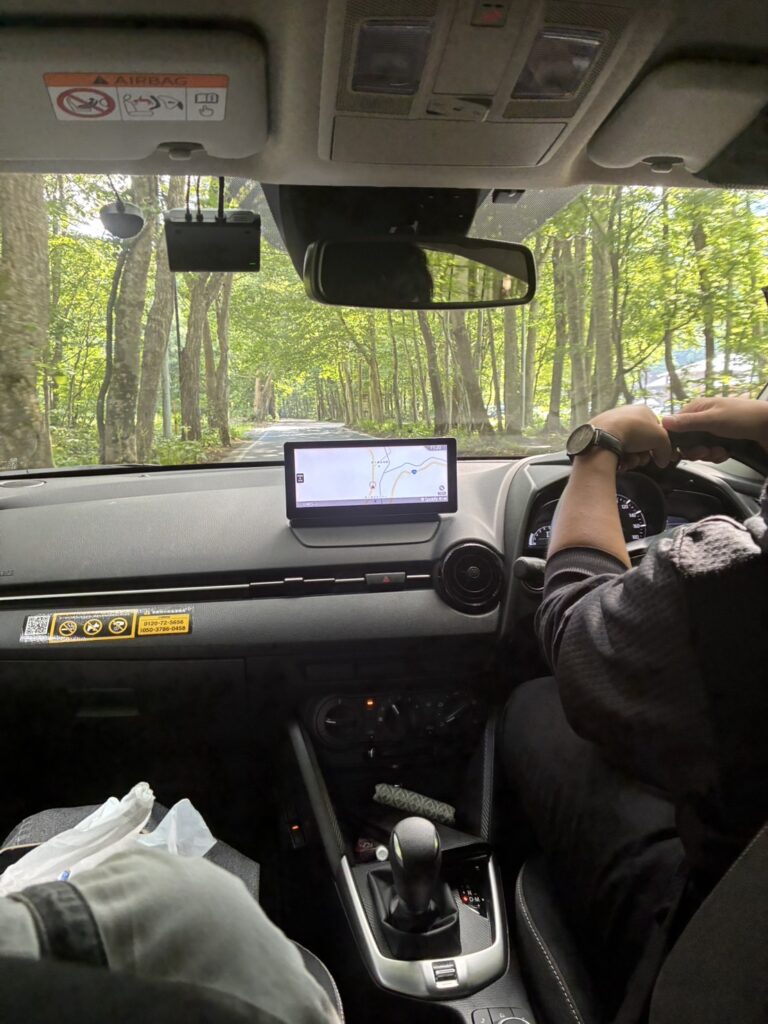 レンタカーを運転し現れたのは日に照らされ緑に覆われた山道